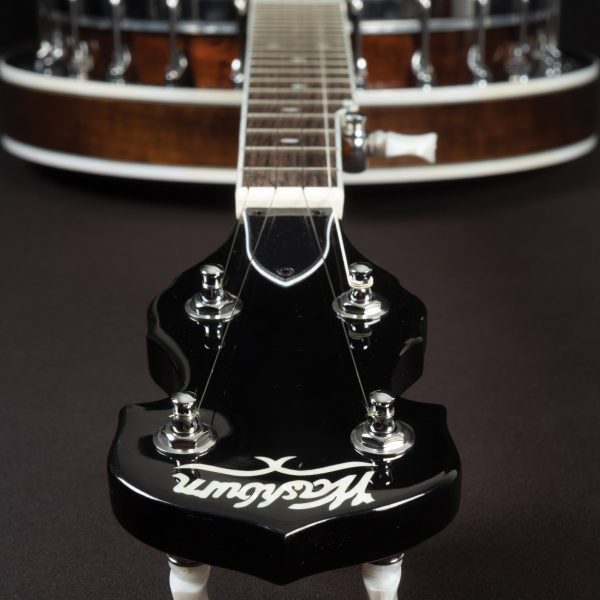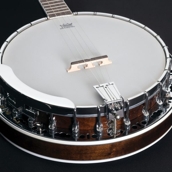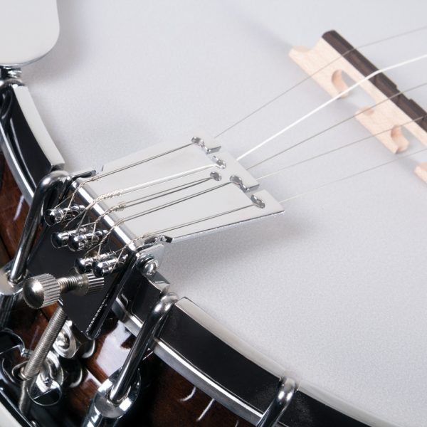 Mahogany resonator and rim, one piece flange with peanut sytle hole, 11" diecast tension hoop, Rolled Brass tone ring, traditional style tailpiece, chrome armrest and geared 5th string Planetary tuner.