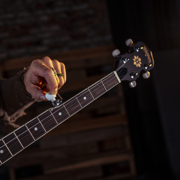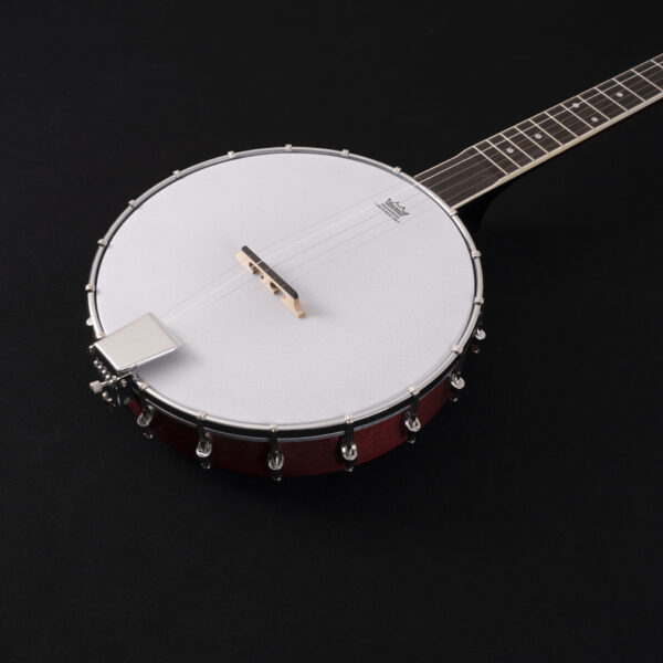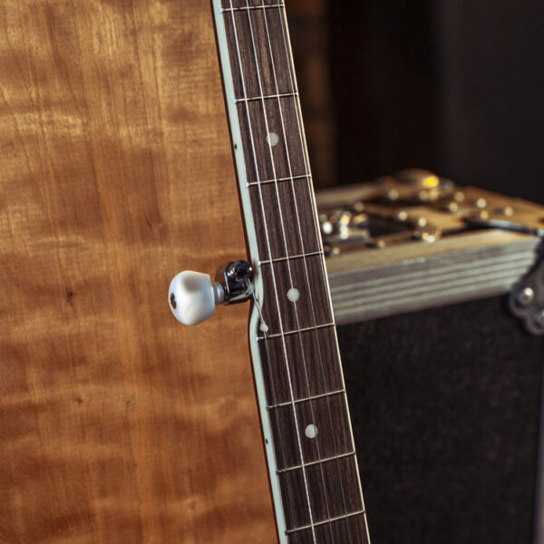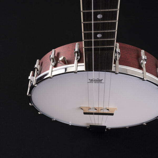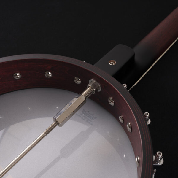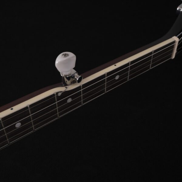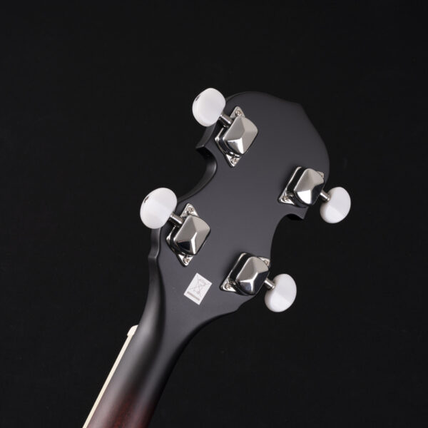 Mahogany rim, 11" grooved tension hoop with 18 brackets, traditional tailpiece, 5th string geared Planetary tuner.