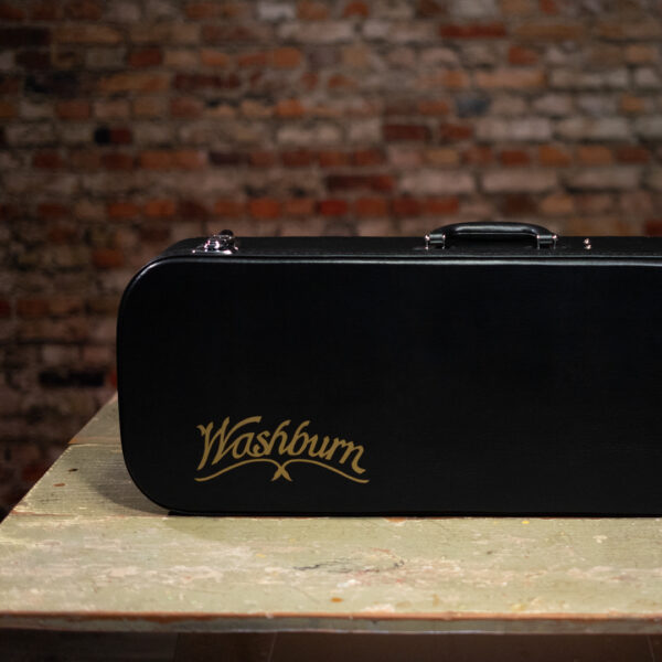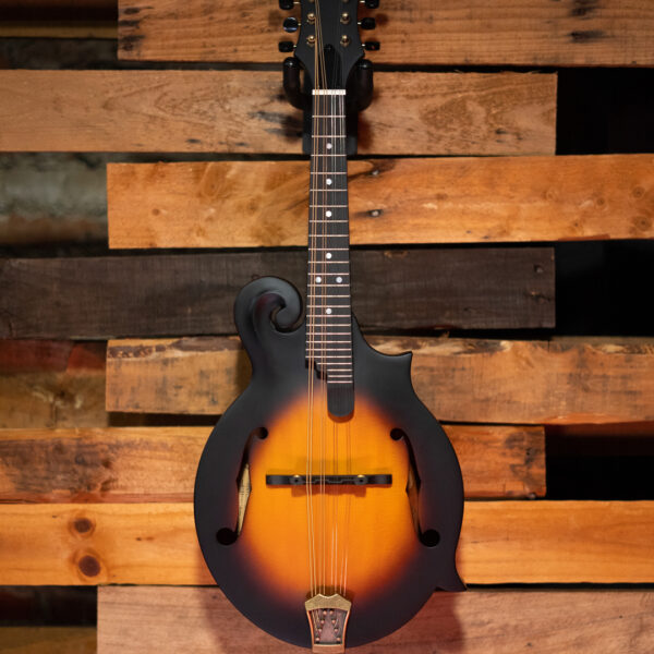 Washburn Americana Series all-solid F-Style Mandolin with solid carved European spruce top, and carved solid Mahogany back and sides, 1-1/4" bone nut, distressed satin finish. Hard shell case included.