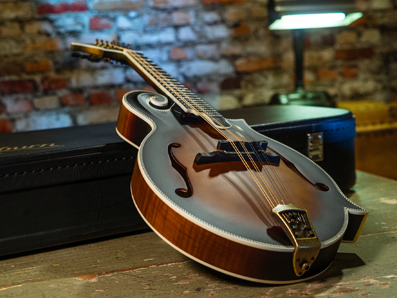 Washburn Americana Series F-Style all-solid Mandolin with carved European spruce top, carved Canadian figured maple back, and figured maple sides, 1-1/4″ bone nut, and vintage distressed cosmetics. Hard shell case included.